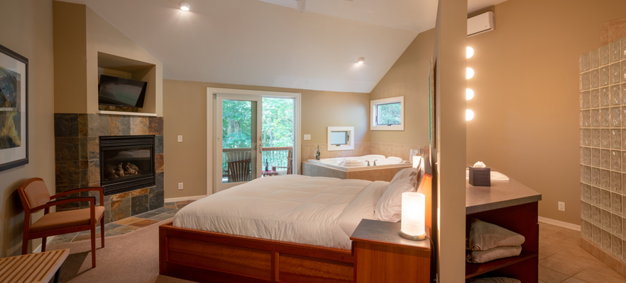 The Garden Suite features a separate bath area with 4.5ft x 6ft jacuzzi tub and 12-inch rain shower head with colored led lights. Large window for garden view. This lower level room is naturally cool in summer with in-floor heat for cool weather stays. Tall ceilings.